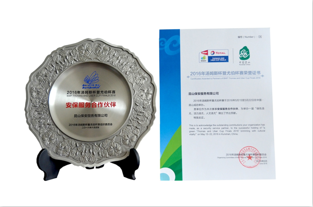 近日,從2016年湯姆斯杯暨尤伯杯賽組織委員會(huì)獲悉,昆山市保安服務(wù)有限公司榮獲“安保服務(wù)合作伙伴”榮譽(yù)稱號(hào)。