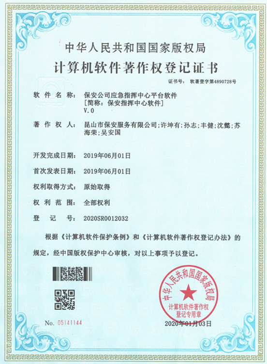 近日,根據(jù)《計算機軟件保護條例》和《計算機軟件著作權(quán)登記辦法》規(guī)定,經(jīng)中國版權(quán)保護中心審核,保安公司應急指揮中心平臺軟件被正式授予《中華人民共和國國家版權(quán)局計算機軟件著作權(quán)登記證書》,證書號為:軟著登記字第4890728號。