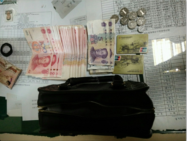 9月25日下午15:30左右,保安公司駐中醫(yī)院保安隊班長張青山在與其隊員進行例行巡邏時,在門診二收費處發(fā)現了一個黑色手提包,包內有大量現金及銀行卡,班長張青山立即向保安隊隊長反應了情況,并將手提包交于警務室保管,隨后返回了自己的執(zhí)勤崗位。