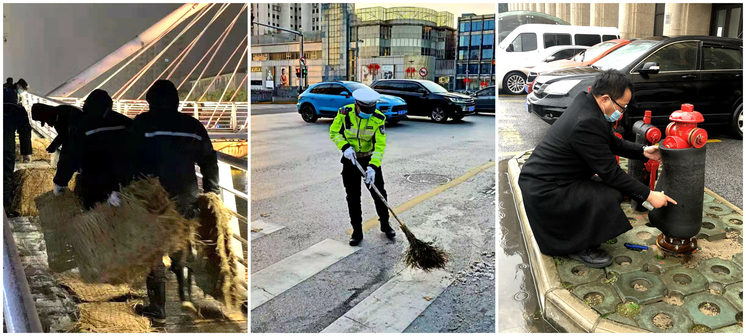 安保公司高度重視此次降溫防寒工作,召開(kāi)專(zhuān)題會(huì)議,部署防寒潮工作任務(wù),制定防寒潮工作方案,成立安保公司專(zhuān)項(xiàng)應(yīng)急工作小組,統(tǒng)一領(lǐng)導(dǎo)、指揮和協(xié)調(diào)防寒潮工作,確保各項(xiàng)工作落到實(shí)處。寒潮來(lái)臨前夕,公司駐點(diǎn)各個(gè)中隊(duì)針對(duì)業(yè)務(wù)范圍對(duì)易積雪、結(jié)冰部位進(jìn)行全面排查,并開(kāi)展針對(duì)性防寒潮措施,連夜鋪設(shè)草墊等防滑物料,保障市民出行安全。次日清晨,部分路面出現(xiàn)冰凍現(xiàn)象,公司隊(duì)員始終堅(jiān)守崗位,并提前到達(dá)工作崗位,掃除路面冰凍,維護(hù)公共秩序。