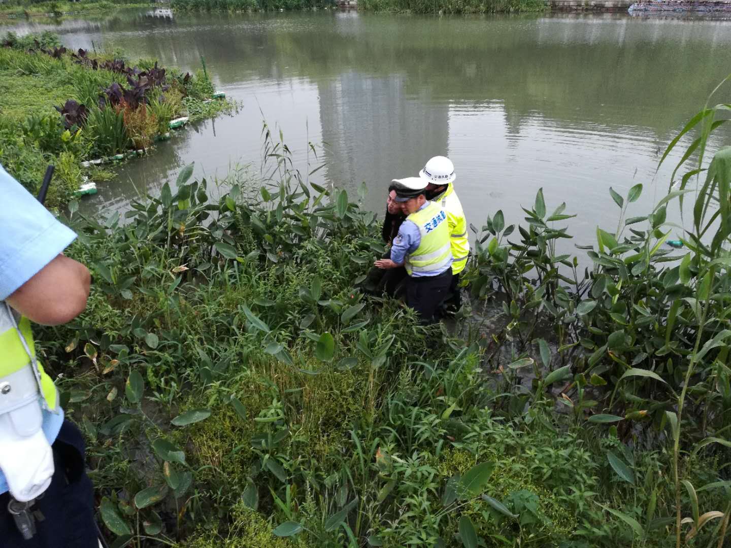 5月25日下午4點(diǎn)15分左右,保安公司道路交通指揮人員在執(zhí)勤過程中,接到指揮對講機(jī)通知,在同豐橋北側(cè)有一女子欲跳河輕生。當(dāng)班隊(duì)長立即帶領(lǐng)三名水性較好隊(duì)員前往現(xiàn)場救援。抵達(dá)現(xiàn)場后,該女子已經(jīng)跳入水中,情況十分緊急,隊(duì)員葉子濤、周長豐在隊(duì)長的指揮下,立即下水開展救援行動,經(jīng)過不懈努力,成功將輕生女子拉至岸邊。隊(duì)長鄭春明為防止此女子再度跳河,耐心的對她做思想工作,直至交警趕到現(xiàn)場將她帶走才離開。