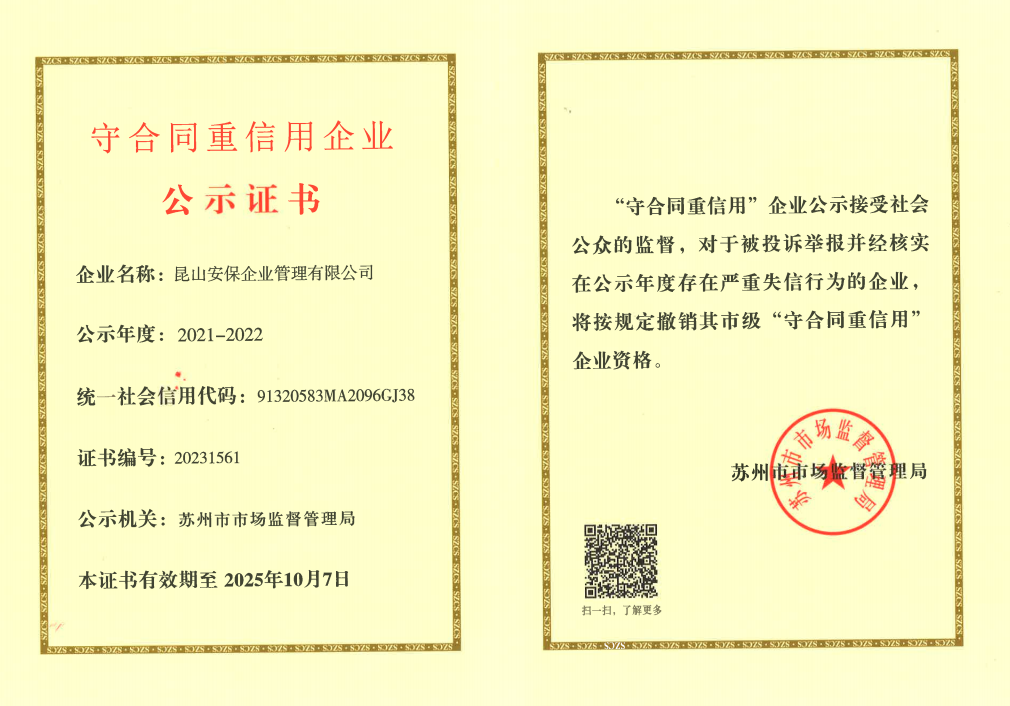 喜報(bào)!安保公司獲蘇州市級(jí)“守合同重信用”...