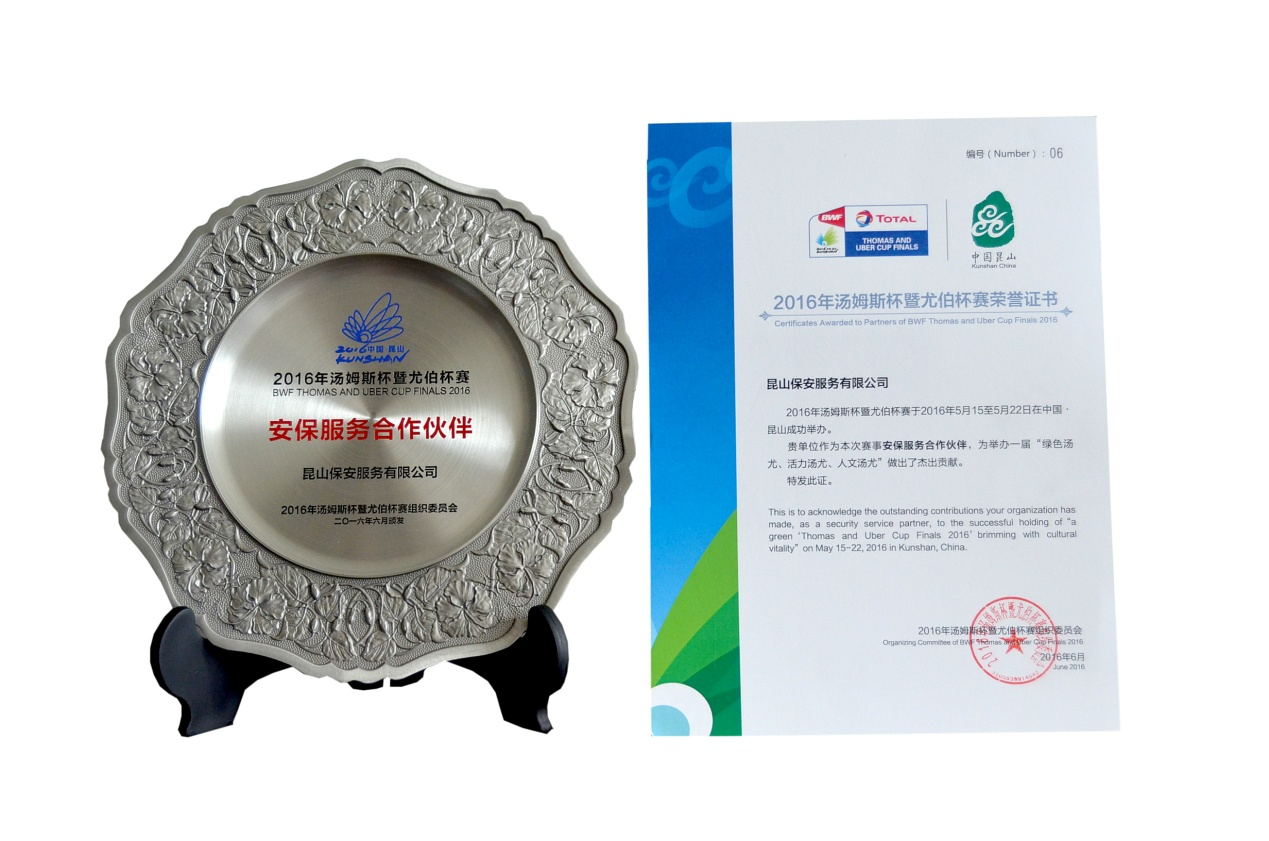 近日,從2016年湯姆斯杯暨尤伯杯賽組織委員會獲悉,昆山市保安服務(wù)有限公司榮獲“安保服務(wù)合作伙伴”榮譽(yù)稱號。
