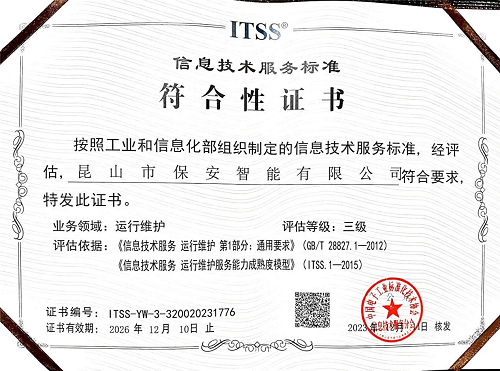 保安智能公司榮獲ITSS信息技術(shù)服務(wù)運行維護三級資質(zhì)